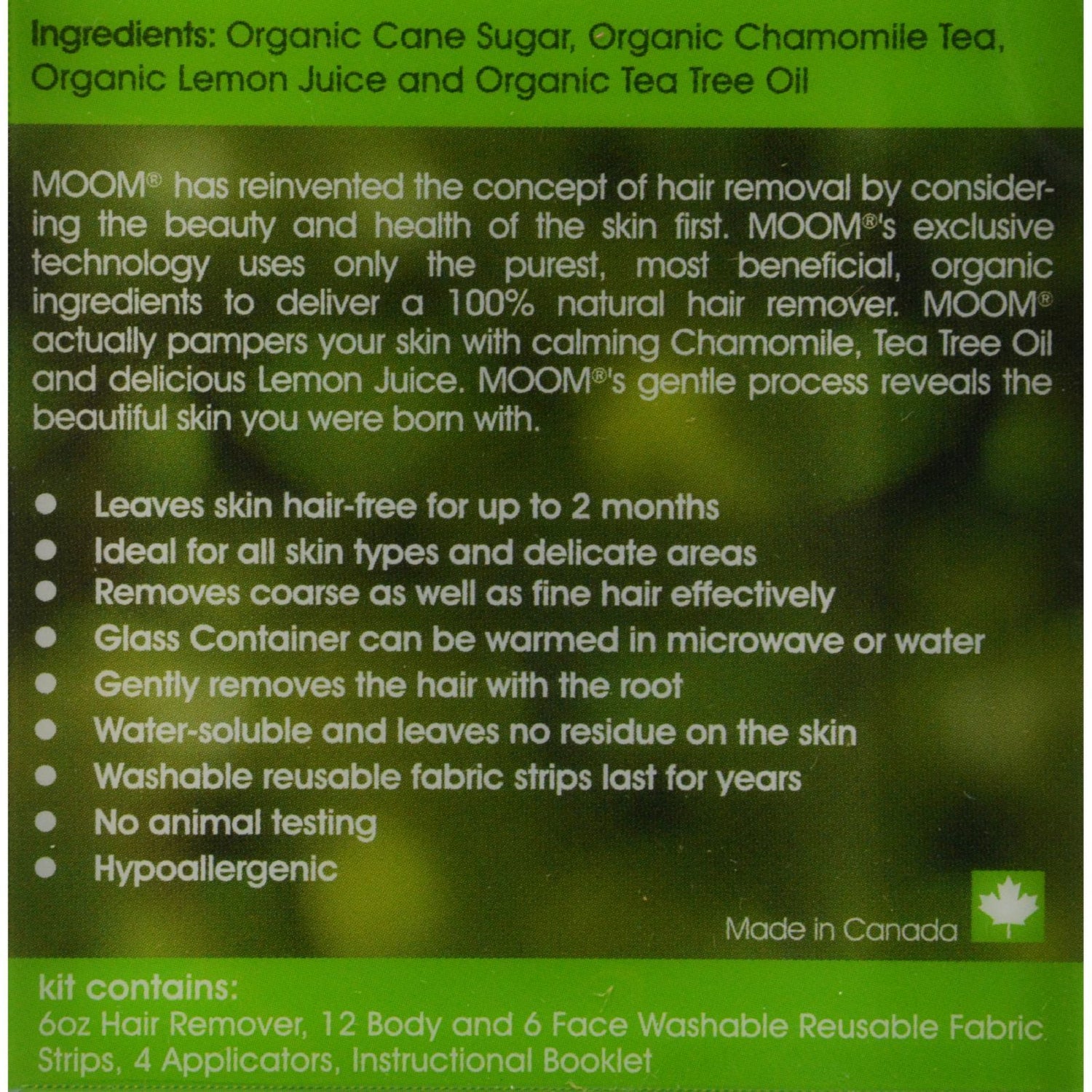 Moom Organic Hair Removal Kit with Tea Tree Classic Description: Organic and 100% Natural With Tree Oil For All Skin Types Chemical Free, Wax Free, Resin Free Sugar Based For Maximum Gentleness Performance and Convenience This kit includes all you need for a surprisingly refreshing hair removal! 6 oz. (170 g) 100% Natural Hair Remover 18 washable, reusable Fabric Strips 4 wooden applicators Moom is chosen by women around the world, who are enthusiastic about natural, herbal skin care. This revolutionary product offers the benefits of long term depilation, diminishes the pain and eliminates the discomfort of waxing and other methods. Moom has taken the ancient art of sugaring and revolutionized it. Adding only the highest quality beneficial ingredients and using fabric strips, makes the process cleaner and more effective. Moom does not damage the skin, thus no need for after treatment lotions to repair the skin. In fact, Moom leaves your skin softer, healthier and younger looking naturally. Moom's exclusive formula gently removes the hair from the root, cleans the hair follicles putting an end to ingrown hairs, leaving your skin hair free and silky smooth for up to 8 weeks. This unique product stands alone as the gentlest, the most effective and the most pleasant long term hair remover. The one made by a mother for her daughters. Virtually painless, because of the precise adhesion level of Moom. Regrowth is sparser and hair finer, reduces hair removal frequency. The original 100% natural, contains only Sugar, Water, Lemon Juice, Chamomile and Tea Tree Oil. As simple as 1, 2, 3. Spread on skin. Rub fabric strip. Pull off. Washable, reusable polycotton strips for face and body last for years. Strong enough for the most stubborn hair, yet gentle enough for the most sensitive area. Can be used for legs, face, bikini area, underarms and whole body. Water soluble - simply rinse with warm water. No animal testing. Unconditionally guaranteed. Free Of Chemical, wax and resin. Disclaimer These statements have not been evaluated by the FDA. These products are not intended to diagnose, treat, cure, or prevent any disease.