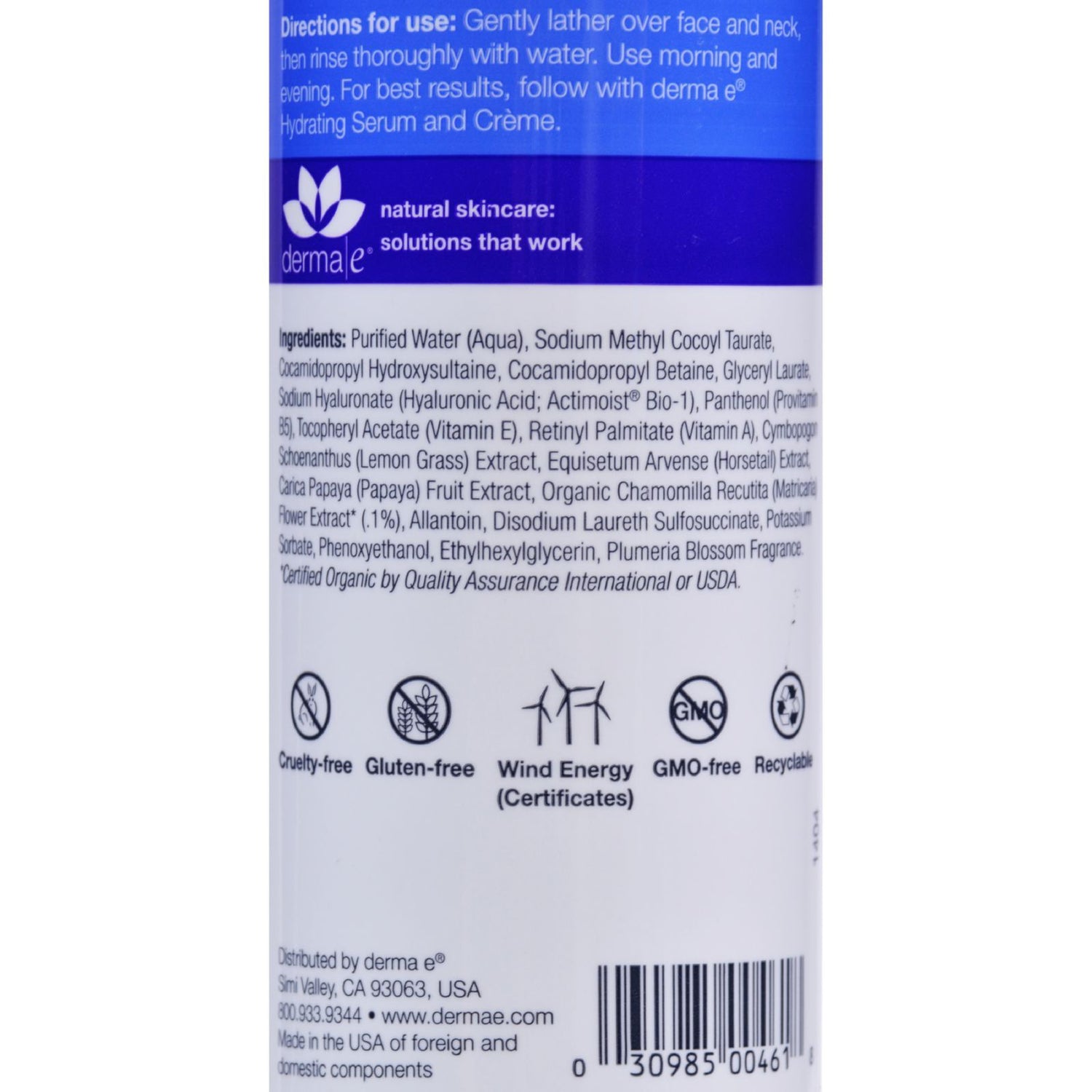 DERMA E, CLEANSER, HYDRATING, WITH HYALURONIC ACID IS ECO-ETHICAL. THIS PRODUCT IS A DEEPLY MOISTURIZING, SULFATE-FREE FORMULA THAT REMOVES MAKEUP AND IMPURITIES WHILE PROMOTING A MORE VISIBLY REJUVENATED AND HYDRATED. DERMA E, CLEANSER, HYDRATING, WITH HYALURONIC ACID COMBINES ULTRA-HYDRATING HYALURONIC ACID WITH CHAMOMILE, LEMONGRASS, PAPAYA AND ANTIOXIDANT-RICH VITAMINS A AND E TO GENTLY CLEANSE AND CONDITION. DERMA E, CLEANSER, HYDRATING, WITH HYALURONIC ACID IS 100% VEGAN, CRUELTY-FREE AND DOES NOT CONTAIN GLUTEN, SOY OR GMOS AND COMES IN A 6 FL. OZ. BOTTLE. SEE DRUG FACTS PANEL FOR WARNINGS.