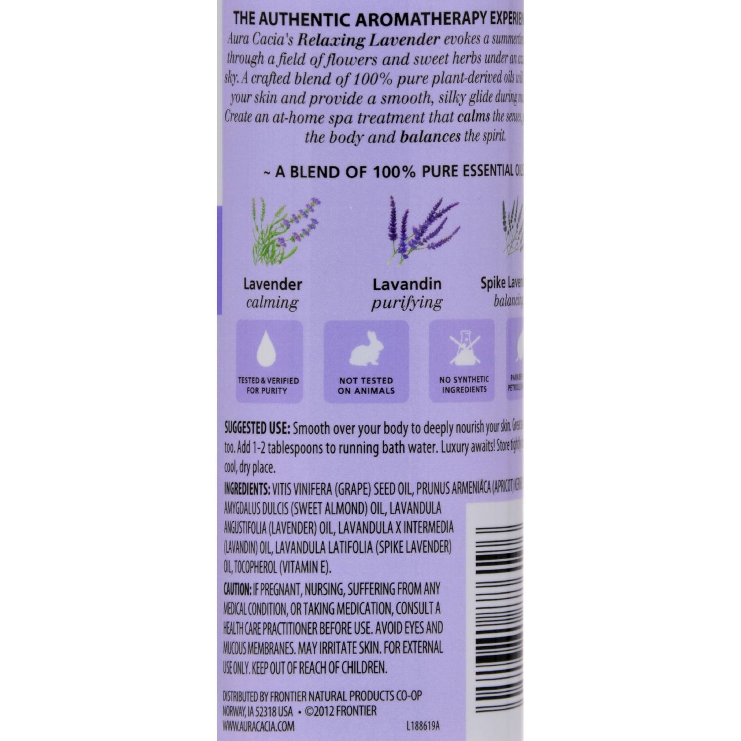 AURA CACIA RELAXING LAVENDER AROMATHERAPY BODY OIL IS A CRAFTED BLEND OF 100% PURE PLANT-DERIVED OILS THAT NOURISH THE SKIN. THIS PETROLEUM-FREE OIL CONTAINS THREE MAIN SCENTS: LAVENDER, LAVANDIN AND SPIKE LAVENDER. WITH NO SYNTHETIC INGREDIENTS OR PARABENS, CREATE AN AT-HOME SPA TREATMENT THAT CALMS THE SENSES, PURIFIES THE BODY AND BALANCES THE SPIRIT. EACH BOTTLE OF AURA CACIA RELAXING LAVENDER AROMATHERAPY BODY OIL CONTAINS 8 FL. OZ. OF PURE ESSENTIAL OILS. SEE LABEL FOR WARNINGS.