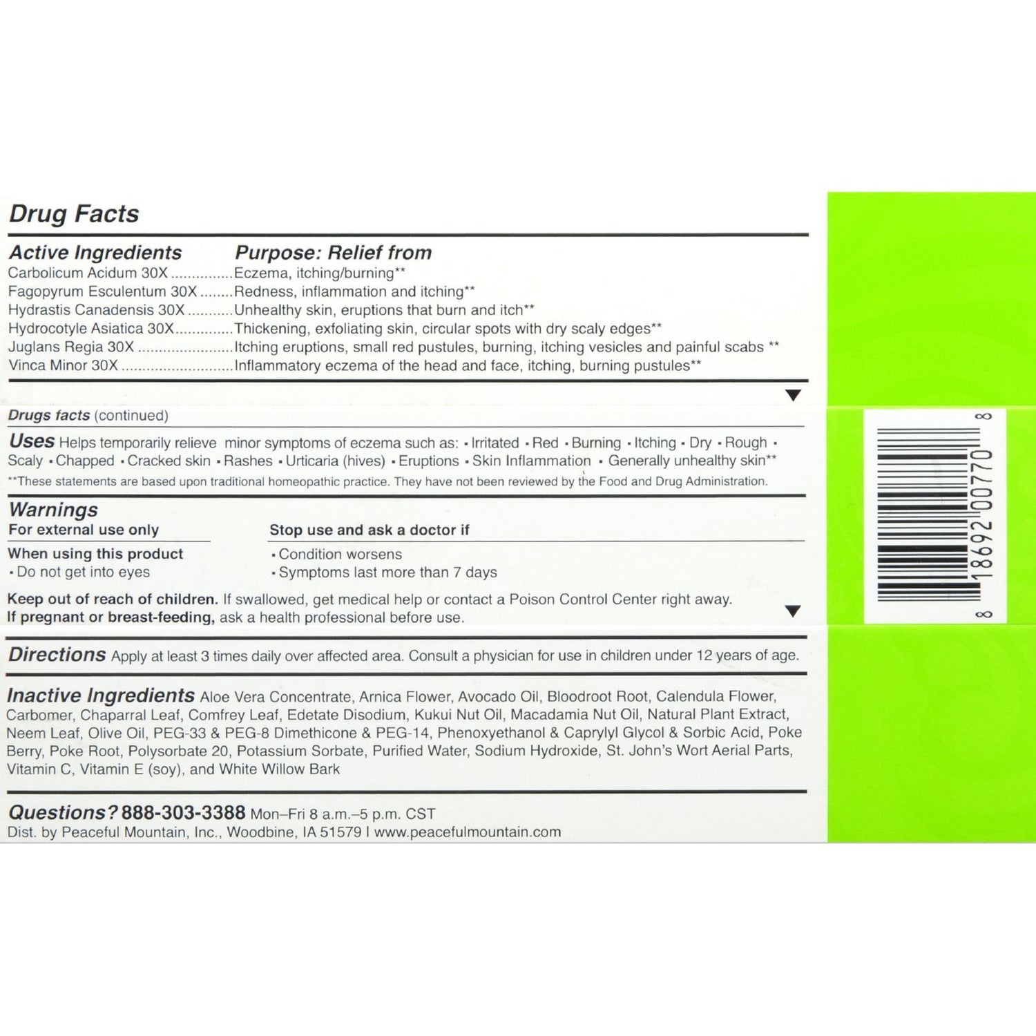 PEACEFUL MOUNTAIN ECZEMA RESCUE HOMEOPATHIC LOTION PROVIDES YOUR FAMILY WITH TEMPORARY SOOTHING RELIEF OF COMMON ECZEMA SYMPTOMS, INCLUDING RASH, BURNING, ITCHING AND DRY OR CRACKED SKIN. TO USE, APPLY AT LEAST THREE TIMES PER DAY TO THE AFFECTED AREA, OR AS DIRECTED BY YOUR PHYSICIAN. THIS TUBE CONTAINS 1 OZ. OF LOTION.
