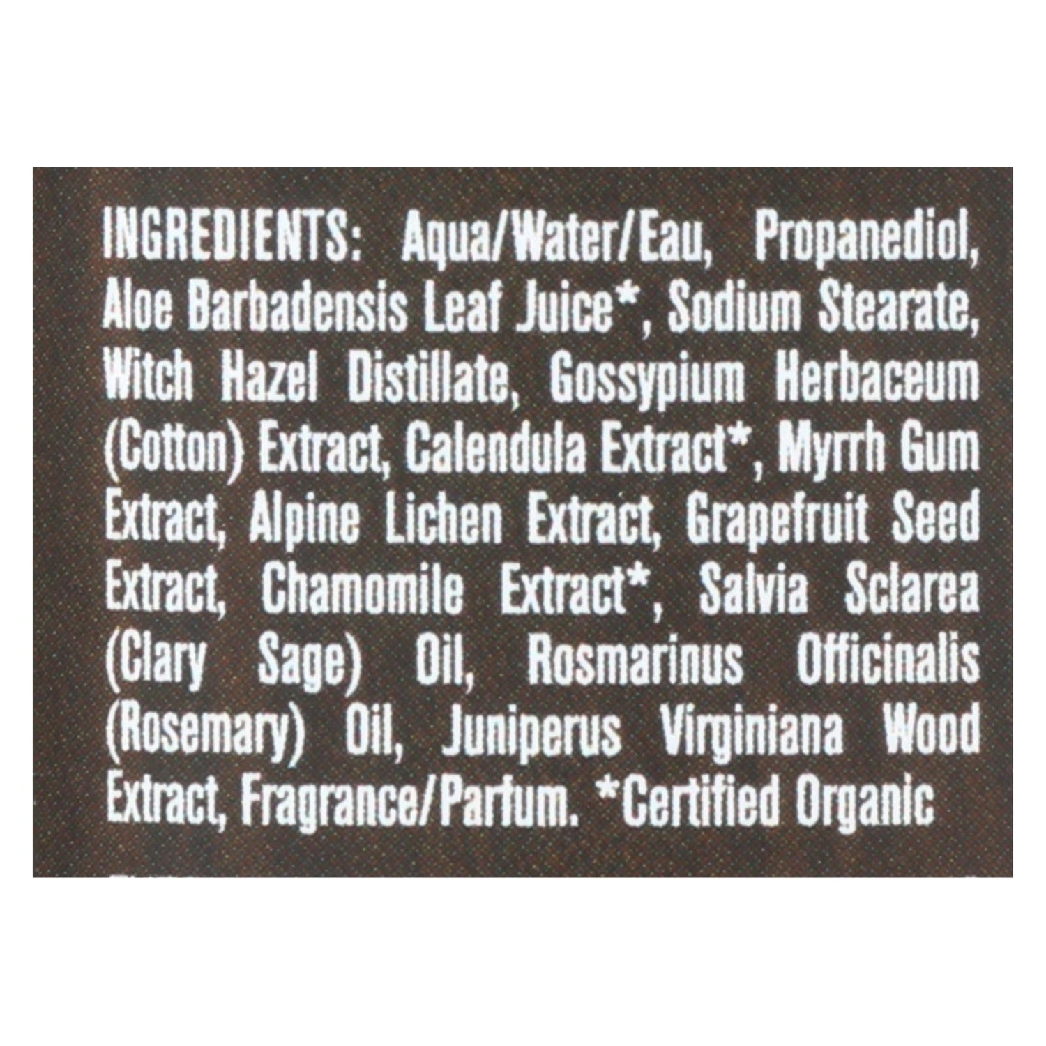 • Ingredients: AGUA/WATER;PROPANEDIOL;ALOE BARBADENSIS LEAF JUICE;SODIUM STEARATE;WITCH HAZEL DISTILLATE;GOSSYPIUM HERBACEUM;COTTON;EXTRACT;CALENDULA EXTRACT;MYRRH GUM EXTRACT;ALPINE LICHEN EXTRACT;GRAPEFRUIT SEED EXTRACT;CHAMOMILE EXTRACT;SALVIA SCLAREA;CLARY SAGE;OIL;ROSMARINUS OFFICINALIS;ROSEMARY;JUNIPERUS VIRGINIANA WOOD EXTRACT;FRAGRANCE/PARFUM