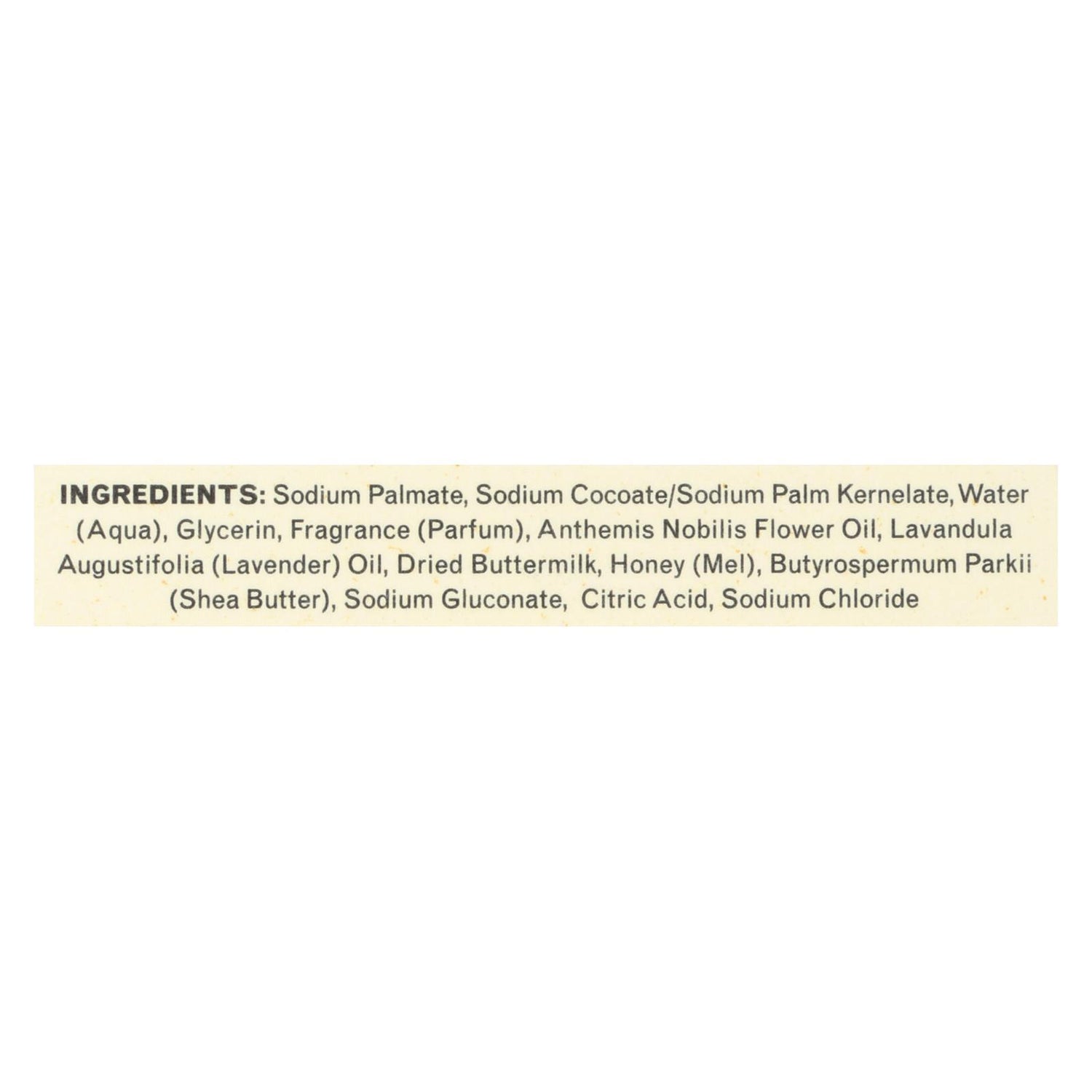 - Ingredients: SODIUM PALMATE;SODIUM COCOATE/SODIUM PALM KERNELATE;WATER (AQUA);GLYCERIN;FRAGRANCE (PARFUM);ANTHEMIS NOBILIS FLOWER OIL;LAVANDULA AUGUSTIFOLIA (LAVENDER) OIL;DRIED BUTTERMILK;HONEY (MEL);BUTYROSPERMUM PARKII (SHEA BUTTER);SODIUM GLUCONATE;CITRIC ACID;SODIUM CHLORIDE
