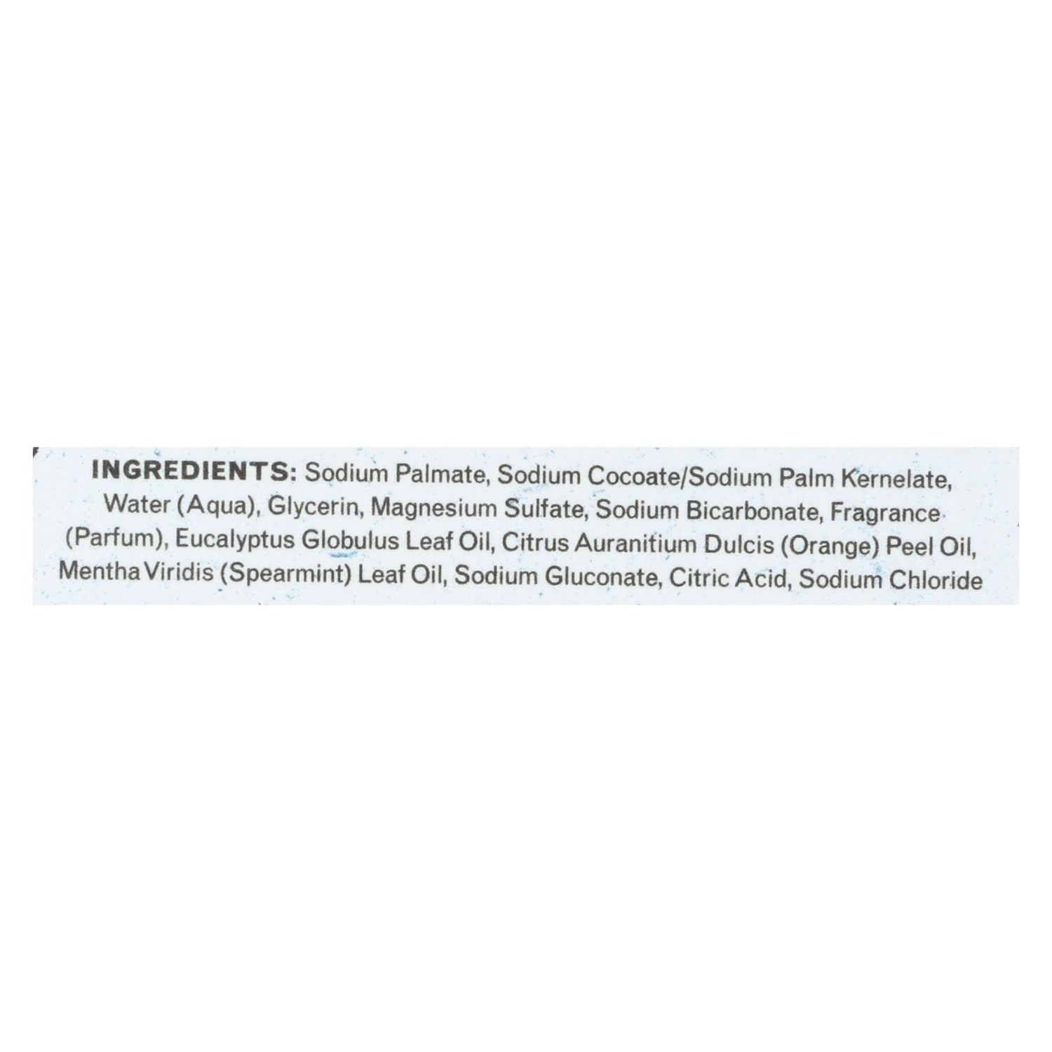 - Ingredients: SODIUM PALMATE;SODIUM COCOATE/SODIUM PALM KERNELATE;WATER (AQUA);GLYCERIN;MAGNESIUM SULFATE;SODIUM BICARBONATE;FRAGRANCE (PARFUM);EUCALYPTUS GLOBULUS LEAF OIL;CITRUS AURANITIUM DULCIS (ORANGE) PEEL OIL;MENTHAVIRIDIS (SPEARMINT) LEAF OIL;SODIUM GLUCONATE;CITRIC ACID;SODIUM CHLORIDE